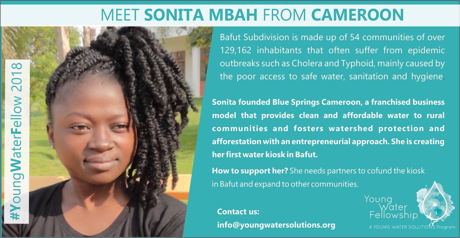 Sonita Mbah was part of Young Water Fellowship 2018 in which she developed the initiative Blue Springs Cameroon that provides clean water to rural communities.
